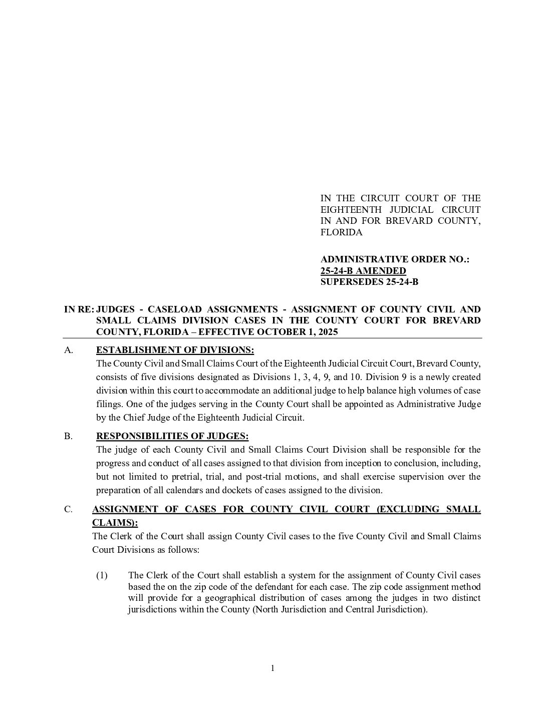 25-24-B AMENDED, SUPERSEDES 25-24-B IN RE: JUDGES – CASELOAD ASSIGNMENTS – ASSIGNMENT OF COUNTY CIVIL AND SMALL CLAIMS CASES IN THE COUNTY COURT FOR BREVARD COUNTY, FLORIDA – EFFECTIVE OCTOBER 1, 2025 – ORDERED 10/08/2025 BY MELANIE CHASE