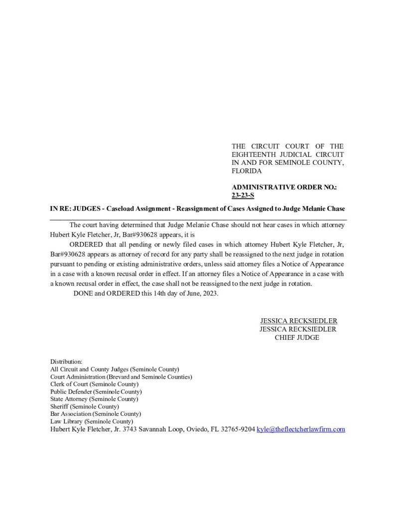 23-23-S IN RE: JUDGES – CASELOAD ASSIGNMENT – REASSIGNMENT OF CASES ASSIGNED TO JUDGE MELANIE CHASE – ORDERED 06/14/2023 BY JESSICA RECKSIEDLER
