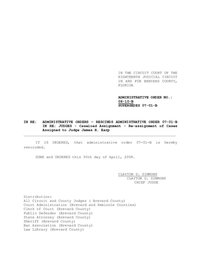 08-10-B, SUPERSEDES 07-01-B IN RE: ADMINISTRATIVE ORDERS – RESCINDS ADMINISTRATIVE ORDER 07-01-B IN RE: JUDGES – CASELOAD ASSIGNMENT – RE-ASSIGNMENT OF CASES ASSIGNED TO JUDGE JAMES H. EARP – ORDERED 4/30/2008 BY CLAYTON D. SIMMONS