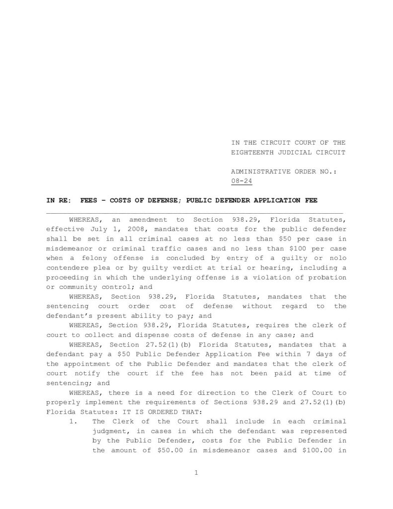 08-24 IN RE: FEES – COSTS OF DEFENSE; PUBLIC DEFENDER APPLICATION FEE – ORDERED 8/11/2008 BY CLAYTON D. SIMMONS