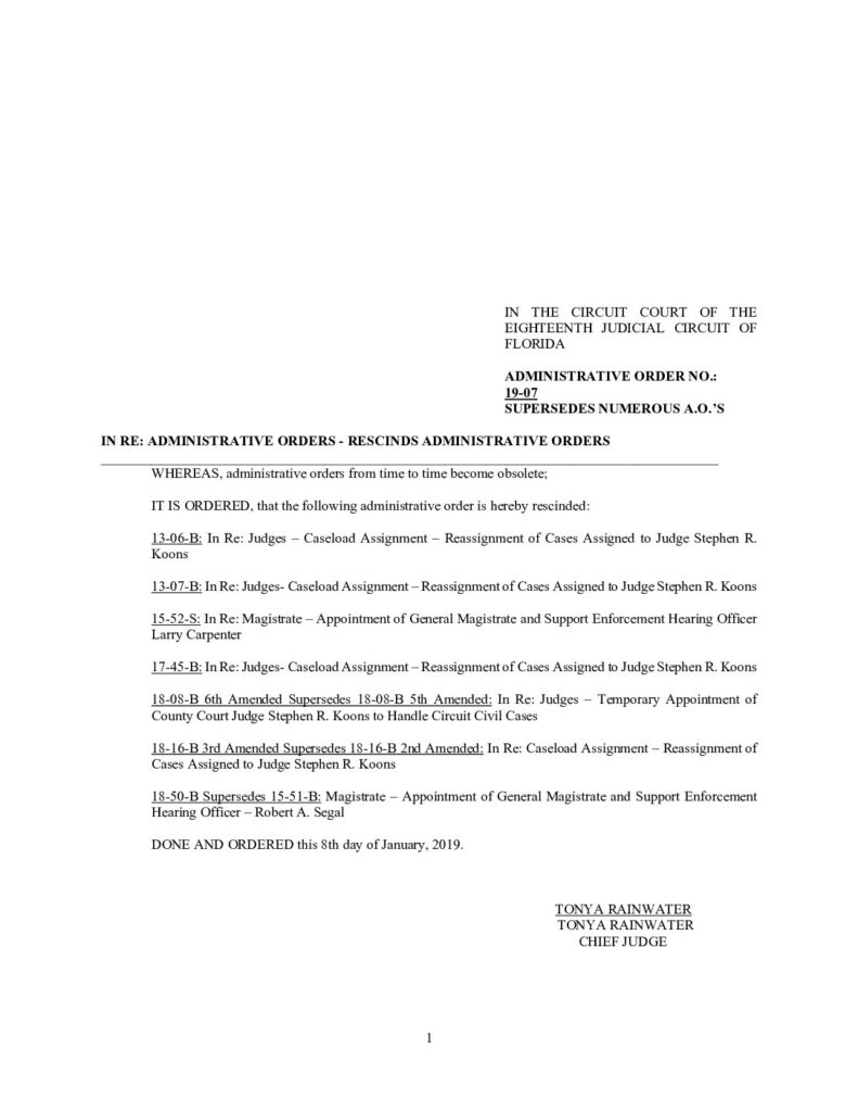 19-07, SUPERSEDES NUMEROUS A.O.’S IN RE: ADMINISTRATIVE ORDERS – RESCINDS ADMINISTRATIVE ORDERS – ORDERED 1/02/2019 BY TONYA RAINWATER