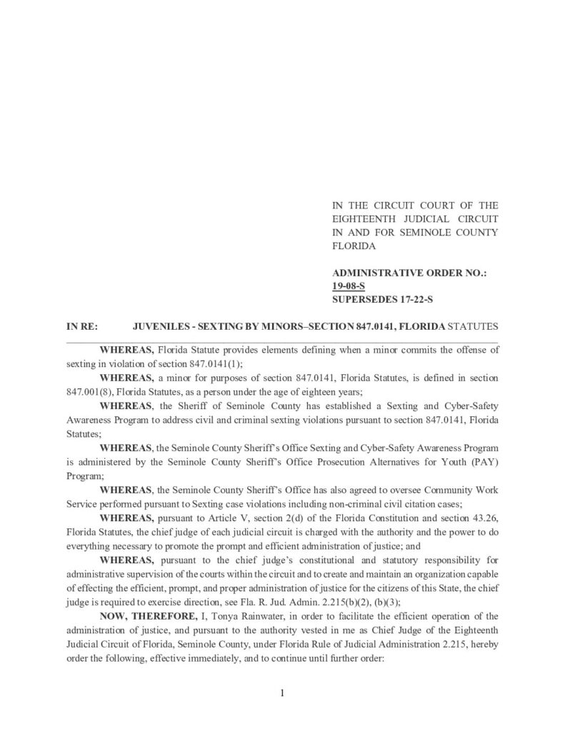 19-08-S: JUVENILES – SEXTING BY MINORS – SECTION 847.0141, FLORIDA STATUTES, SUPERSEDES 17-22-S – ORDERED 1/09/2019 BY TONYA RAINWATER