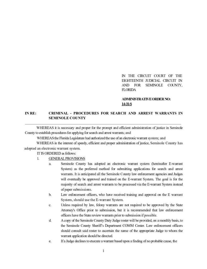 14-31-S IN RE: CRIMINAL – PROCEDURES FOR SEARCH AND ARREST WARRANTS IN SEMINOLE COUNTY – 8/04/2014 BY JOHN M. HARRIS