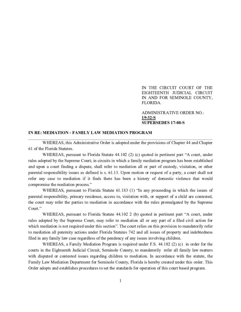 19-32-S, SUPERSEDES 17-08-S IN RE: MEDIATION – FAMILY LAW MEDIATION PROGRAM – ORDERED 7/29/2019 BY LISA DAVIDSON