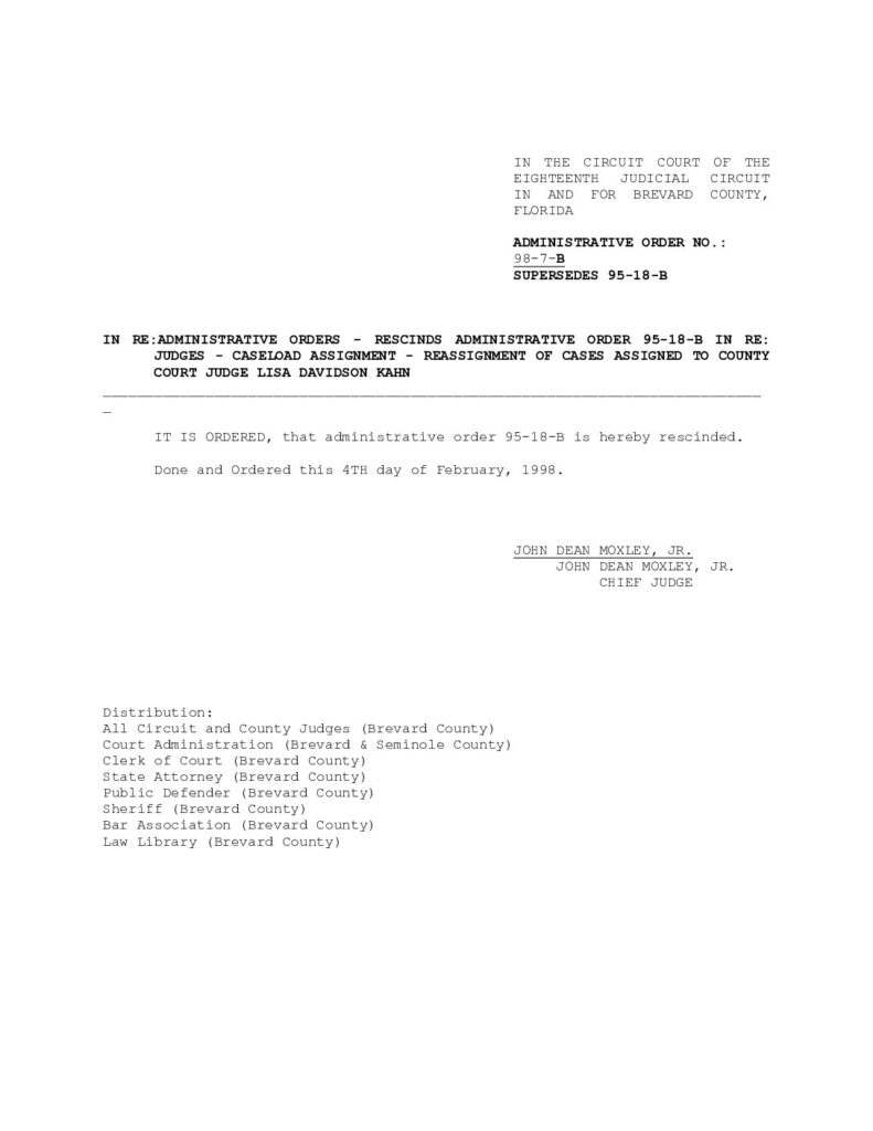 98-7-B: SUPERSEDES 95- 18-B IN RE: JUDGES – CASELOAD ASSIGNMENT – REASSIGNMENT OF CASES ASSIGNED TO COUNTY COURT JUDGE LISA DAVIDSON – ORDERED 2/04/1998 BY JOHN DEAN MOXLEY, JR.