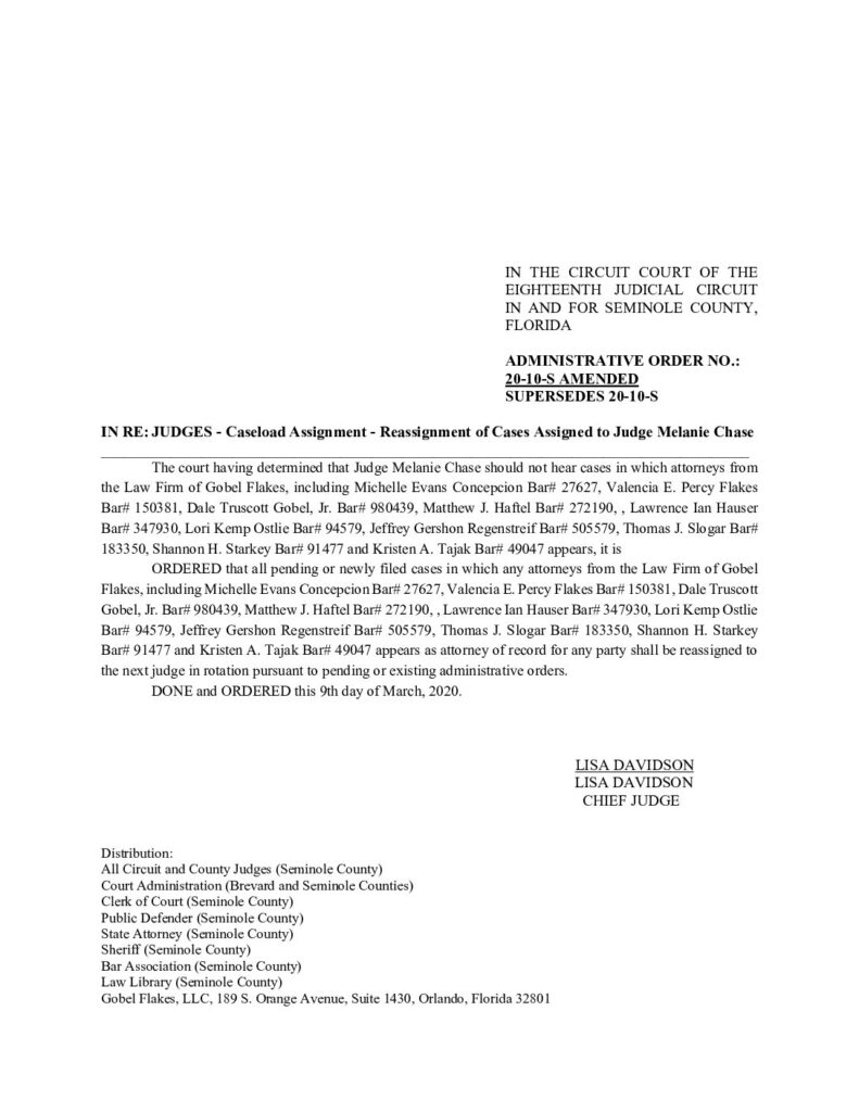 20-10-S AMENDED, SUPERSEDES 20-10-S IN RE: JUDGES – CASELOAD ASSIGNMENT – REASSIGNMENT OF CASES ASSIGNED TO JUDGE MELANIE CHASE – ORDERED 3/09/2020 BY LISA DAVIDSON