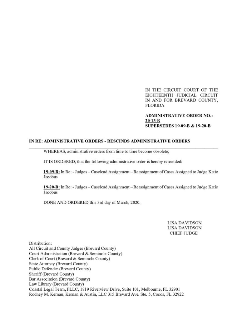 20-13-B IN RE: ADMINISTRATIVE ORDERS – RESCINDS ADMINISTRATIVE ORDERS – ORDERED 3/03/2020 BY LISA DAVIDSON
