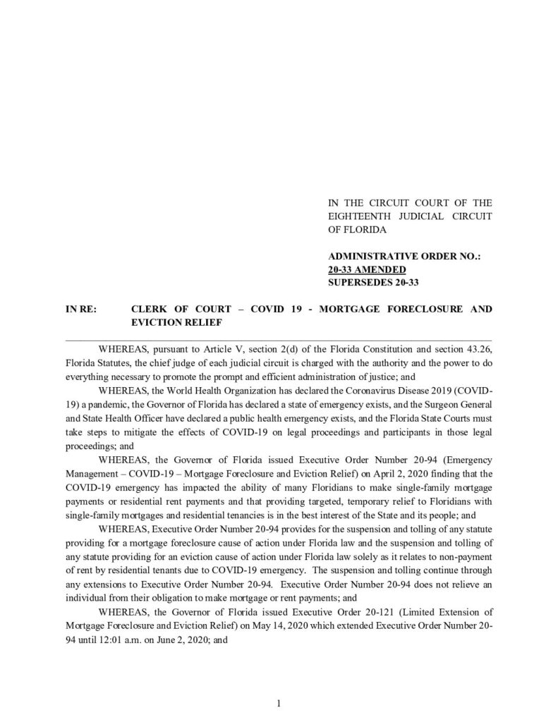20-33 AMENDED, SUPERSEDES 20-33 IN RE: CLERK OF COURT – COVID 19 – MORTGAGE FORECLOSURE AND EVICTION RELIEF – ORDERED 9/09/2020 BY LISA DAVIDSON