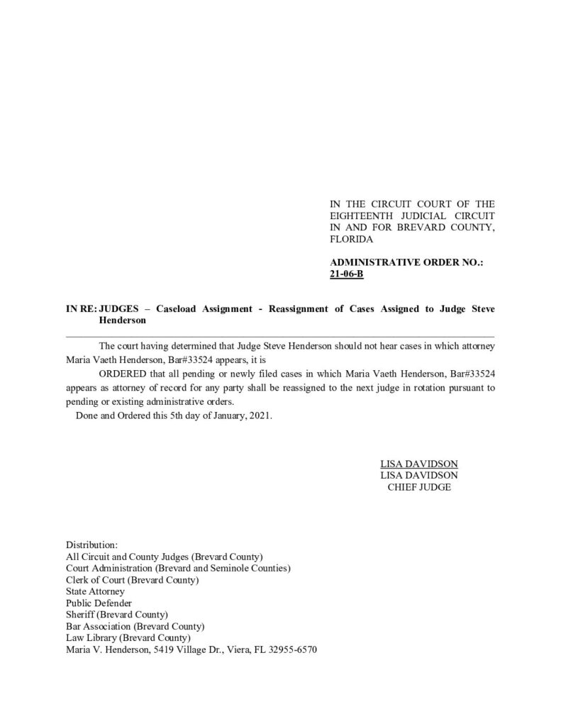 21-06-B IN RE: CASELOAD ASSIGNMENT – REASSIGNMENT OF CASES ASSIGNED TO JUDGE STEVE HENDERSON – ORDERED 1/05/2021 BY LISA DAVIDSON