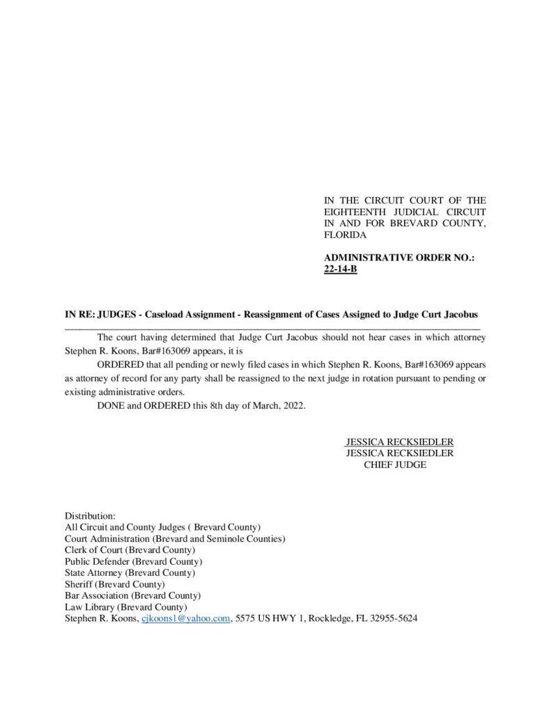 22-14-B IN RE: CASELOAD ASSIGNMENT – REASSIGNMENT OF CASES ASSIGNED TO JUDGE CURT JACOBUS; THE COURT HAVING DETERMINED THAT JUDGE CURT JACOBUS SHOULD NOT HEAR CASES IN WHICH ATTORNEY STEPHEN R. KOONS APPEARS – ORDERED 3/08/2022 BY JESSICA RECKSIEDLER