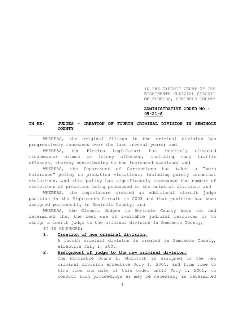 05-21-S IN RE: JUDGES – CREATION OF FOURTH CRIMINAL DIVISION IN SEMINOLE COUNTY – ORDERED 3/9/2005 BY JAMES E.C. PERRY