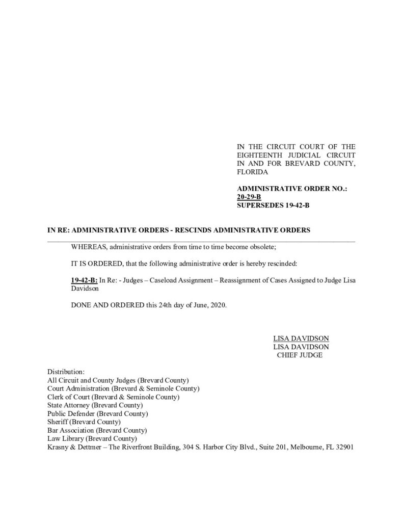 20-29-B, SUPERSEDES 19-42-B IN RE: ADMINISTRATIVE ORDERS – RESCINDS ADMINISTRATIVE ORDERS – ORDERED 6/24/2020 BY LISA DAVIDSON