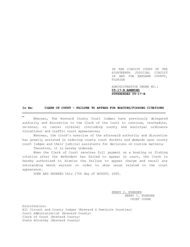 05-17-B AMENDED, SUPERSEDES 05-17-B IN RE: CLERK OF COURT – FAILURE TO APPEAR FOR BOATING/FISHING CITATIONS – ORDERED 8/17/2005 BY KERRY I. EVANDER