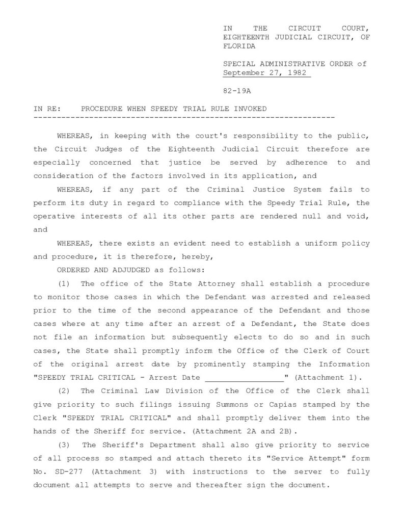 82-19 (82-19A): PROCEDURE WHEN SPEEDY TRIAL RULE INVOKED – ORDERED 10/17/1982 BY J. WILLIAM WOODSON