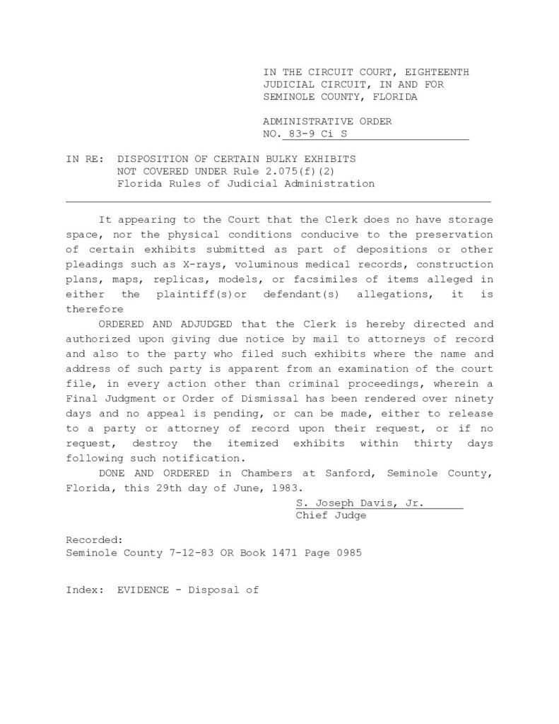 83-9-S (83-9 Ci S): DISPOSITION OF CERTAIN BULKY EXHIBITS NOT COVERED UNDER RULE 2.075(F)(2) FLORIDA RULES OF JUDICIAL ADMINISTRATION – ORDERED 6/29/1983 BY JOSEPH DAVIS, JR.