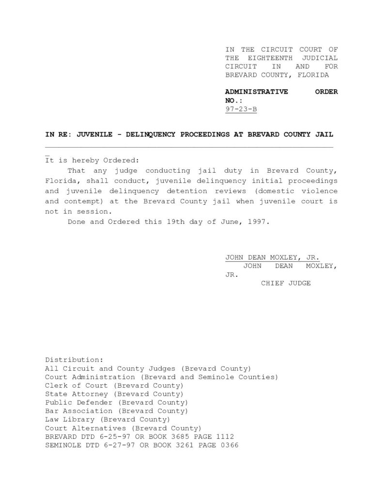 97-23-B IN RE: JUVENILE – DELINQUENCY PROCEEDINGS AT BREVARD COUNTY JAIL – ORDERED 6/19/1997 BY JOHN DEAN MOXLEY JR.