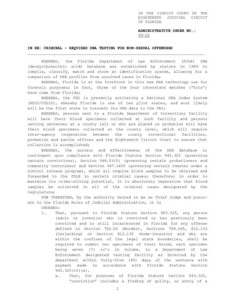 99-22 IN RE: CRIMINAL – REQUIRED DNA TESTING FOR NON-SEXUAL OFFENDERS – ORDERED 7/09/1999 BY J. PRESTON SILVERNAIL