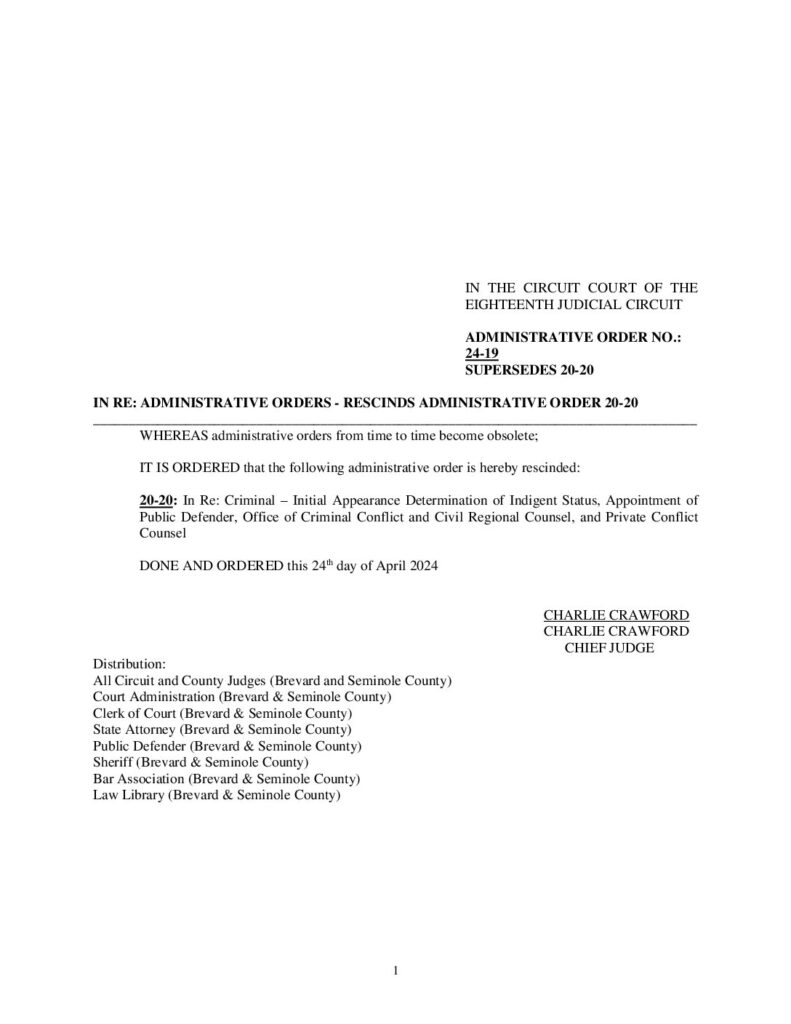 24-19 SUPERSEDES 20-20 IN RE: ADMINISTRATIVE ORDERS – RESCINDS ADMINISTRATIVE ORDER 20-20 – ORDERED 4/24/2024 BY CHARLES G. CRAWFORD