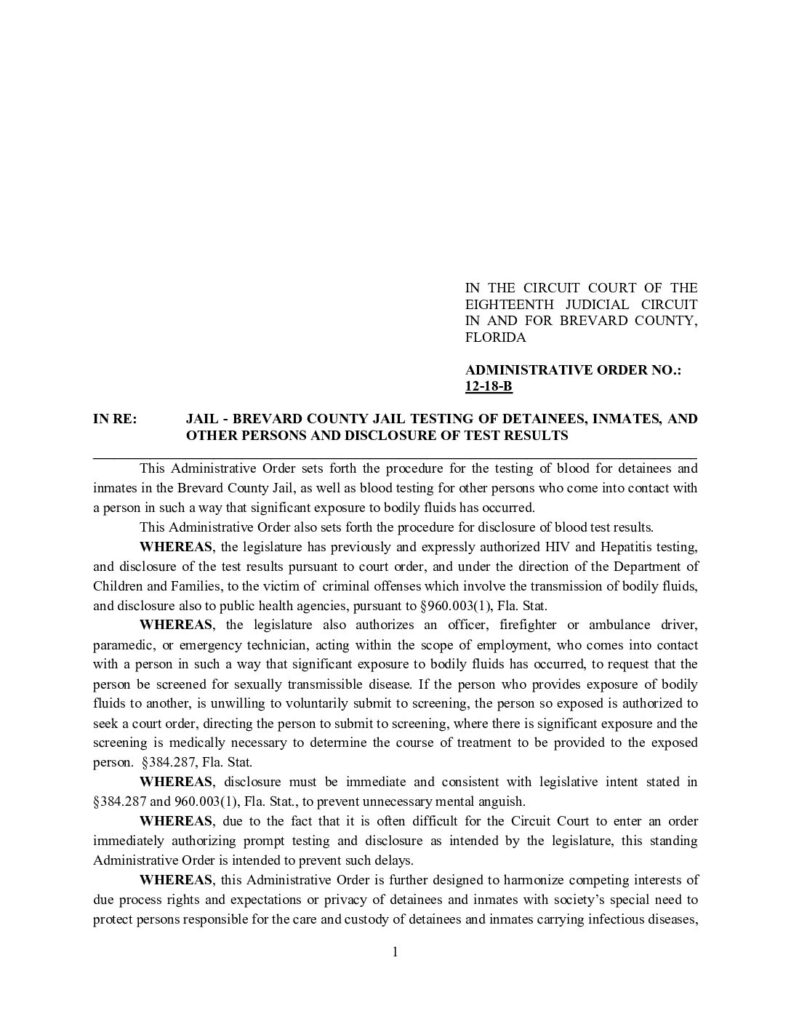12-18-B IN RE: JAIL – BREVARD COUNTY JAIL TESTING OF DETAINEES, INMATES, AND OTHER PERSONS AND DISCLOSURE OF TEST RESULTS – ORDERED 6/20/2012 BY ALAN A. DICKEY