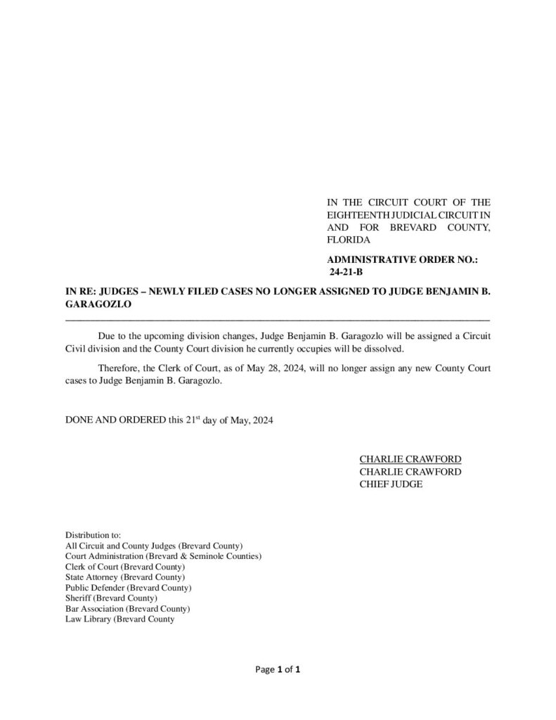 24-21-B IN RE: JUDGES – NEWLY FILED CASES NO LONGER ASSIGNED TO JUDGE BENJAMIN B. GARAGOZLO ORDERED BY CHARLES G. CRAWFORD ON 05/21/2024
