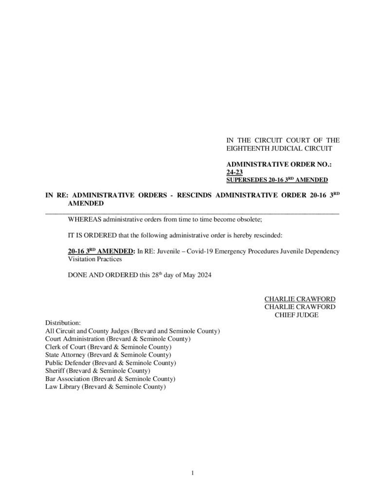 24-23 SUPERSEDES 20-16 3RD AMENDED IN RE: ADMINISTRATIVE ORDERS – RESCINDS ADMINISTRATIVE ORDER 20-16 3RD AMENDED – ORDERED 05/28/2024 BY CHARLES G. CRAWFORD