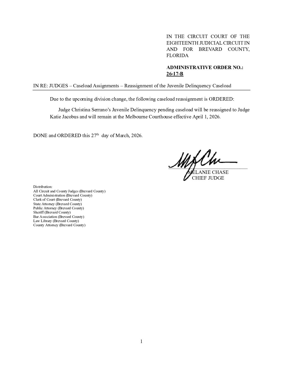 26-17-B IN RE: JUDGES – CASELOAD ASSIGNMENTS – REASSIGNMENT OF THE JUVENILE DELINQUENCY CASELOAD – ORDERED 3/27/2026 BY MELANIE CHASE