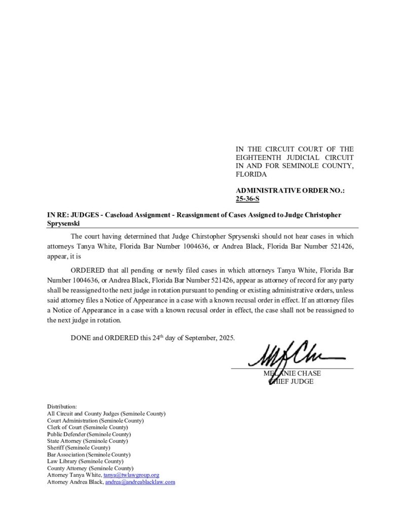 25-36-S IN RE: JUDGES – CASELOAD ASSIGNMENT – REASSIGNMENT OF CASES ASSIGNED TO JUDGE CHRISTOPHER SPRYSENSKI – ORDERED 9/24/2025 BY MELANIE CHASE