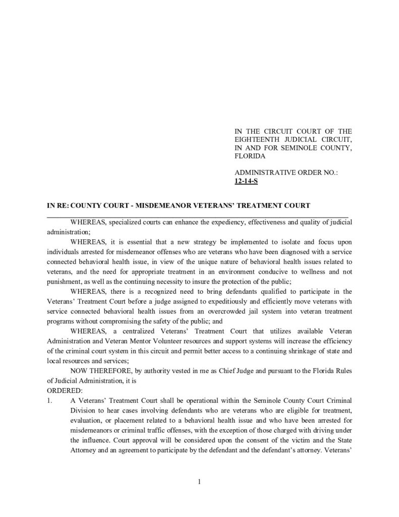 12-14-S IN RE: COUNTY COURT – MISDEMEANOR VETERANS’ TREATMENT COURT – ORDERED 5/18/2012 BY ALAN. A. DICKEY