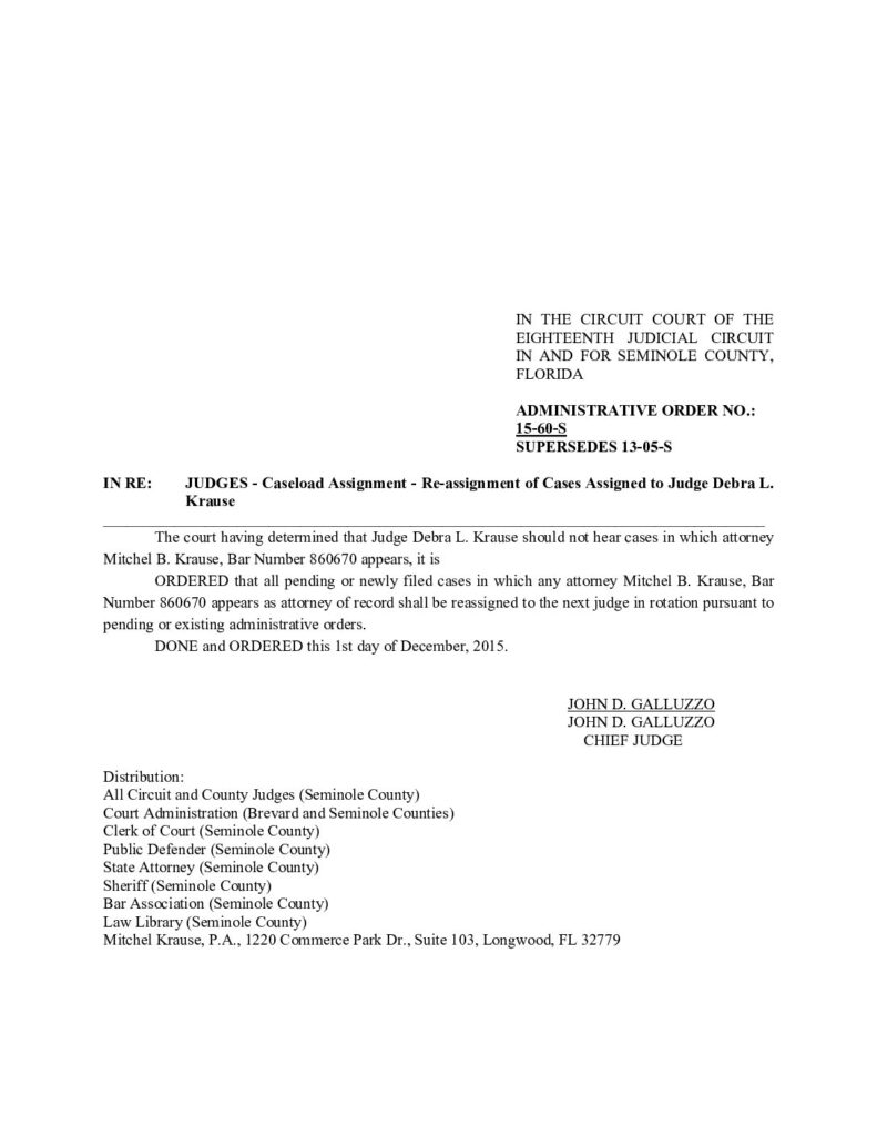 15-60-S, SUPERSEDES 13-05-S IN RE: JUDGES – CASELOAD ASSIGNMENT, CASELOAD REASSIGNMENT OF CASES ASSIGNED TO JUDGE DEBRA L. KRAUSE – ORDERED 12/01/2015 BY JOHN D. GALLUZZO