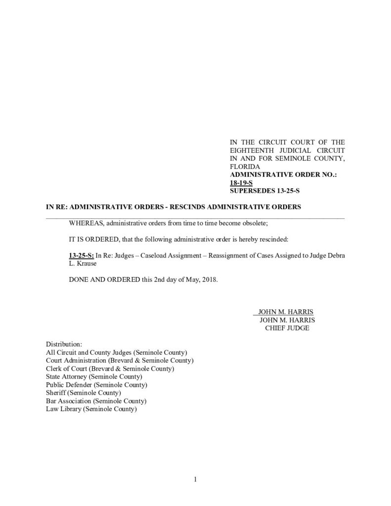 18-19-S, SUPERSEDES 13-25-S IN RE: ADMINISTRATIVE ORDERS – RESCINDS ADMINISTRATIVE ORDERS – ORDERED 5/02/2018 BY JOHN M. HARRIS