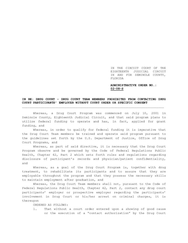 02-08-S IN RE: DRUG COURT – DRUG COURT TEAM MEMBERS PROHIBITED FROM CONTACTING DRUG COURT PARTICIPANTS’ EMPLOYER WITHOUT COURT ORDER OR SPECIFIC CONSENT – ORDERED 1/16/2002 BY BRUCE W. JACOBUS