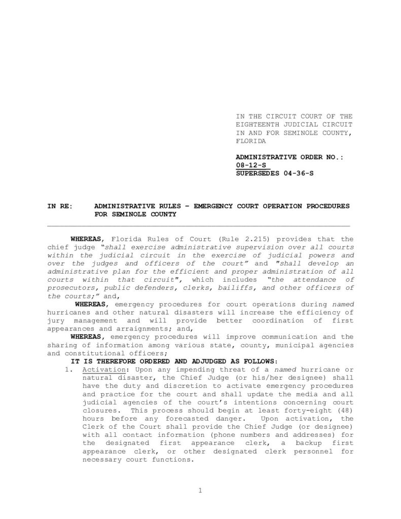08-12-S, SUPERSEDES 04-36-S IN RE: ADMINISTRATIVE RULES – EMERGENCY COURT OPERATION PROCEDURES FOR SEMINOLE COUNTY – ORDERED 6/4/2008 BY CLAYTON D. SIMMONS