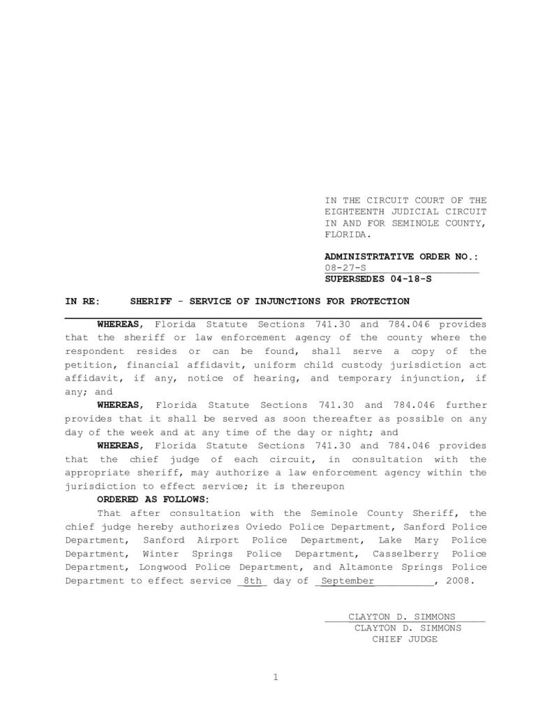 08-27-S, SUPERSEDES 04-18-S IN RE: SHERIFF – SERVICE OF INJUNCTIONS FOR PROTECTION – ORDERED 9/8/2008 BY CLAYTON D. SIMMONS