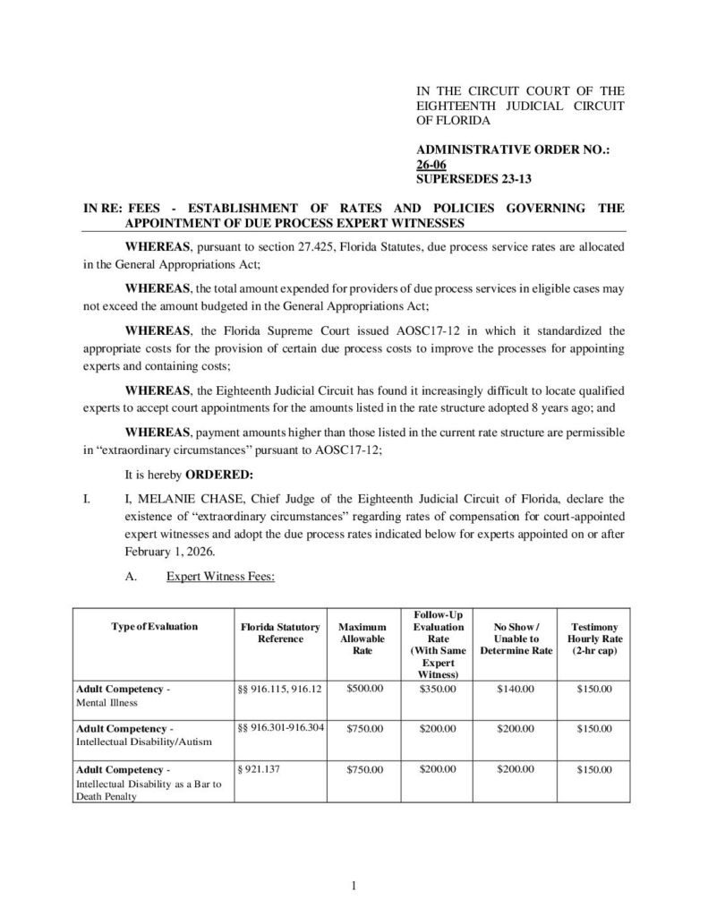 26-06, SUPERSEDES 23-13 IN RE: FEES – ESTABLISHMENT OF RATES AND POLICIES GOVERNING THE APPOINTMENT OF DUE PROCESS EXPERT WITNESSES – ORDERED 1/08/2026 BY MELANIE CHASE