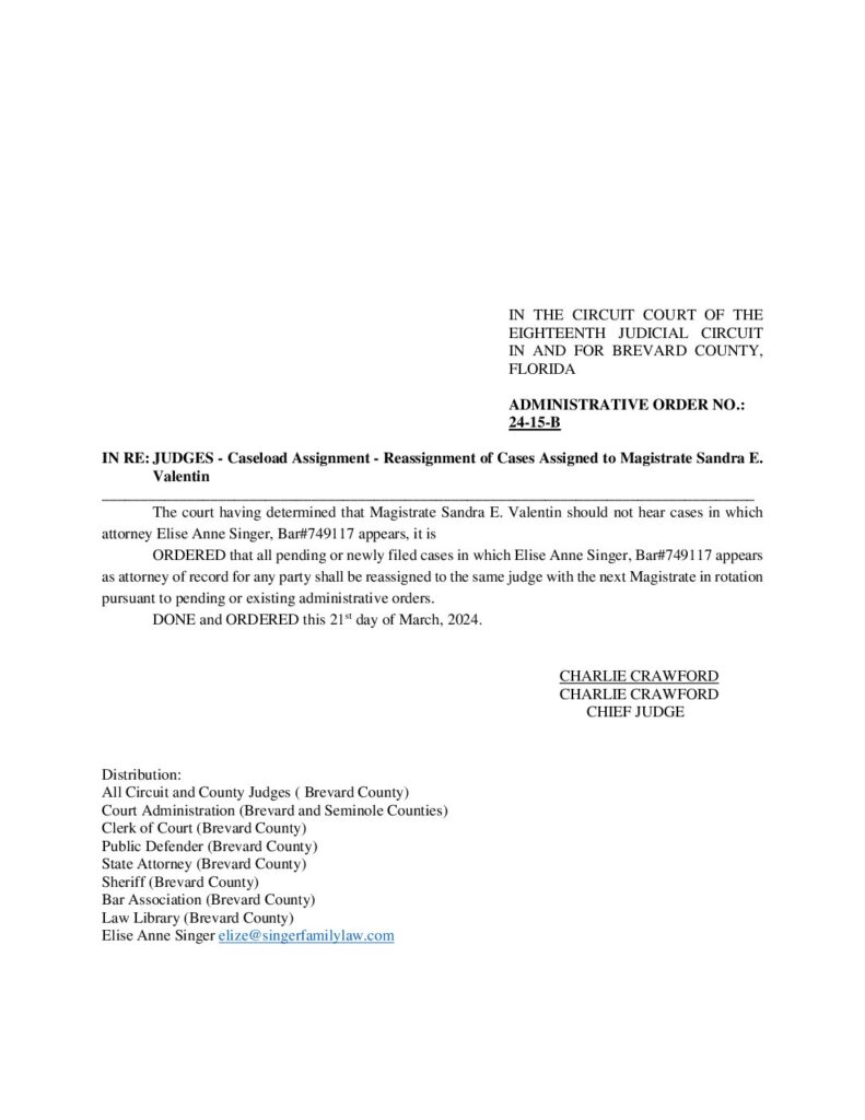 24-15-B IN RE: JUDGES – CASELOAD ASSIGNMENT – REASSIGNMENT OF CASES ASSIGNED TO MAGISTRATE SANDRA E. VALENTINE – ORDERED 03/212024 BY CHARLES G. CRAWFORD