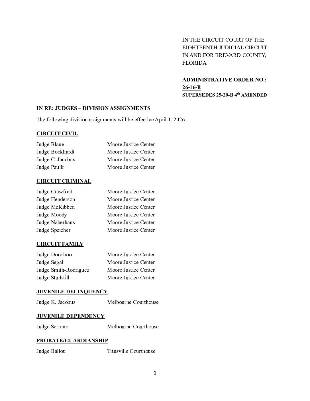 26-16-B, SUPERSEDES 25-20-B 4th AMENDED IN RE: JUDGES – DIVISION ASSIGNMENTS – ORDERED 3/278/2026 BY MELANIE CHASE