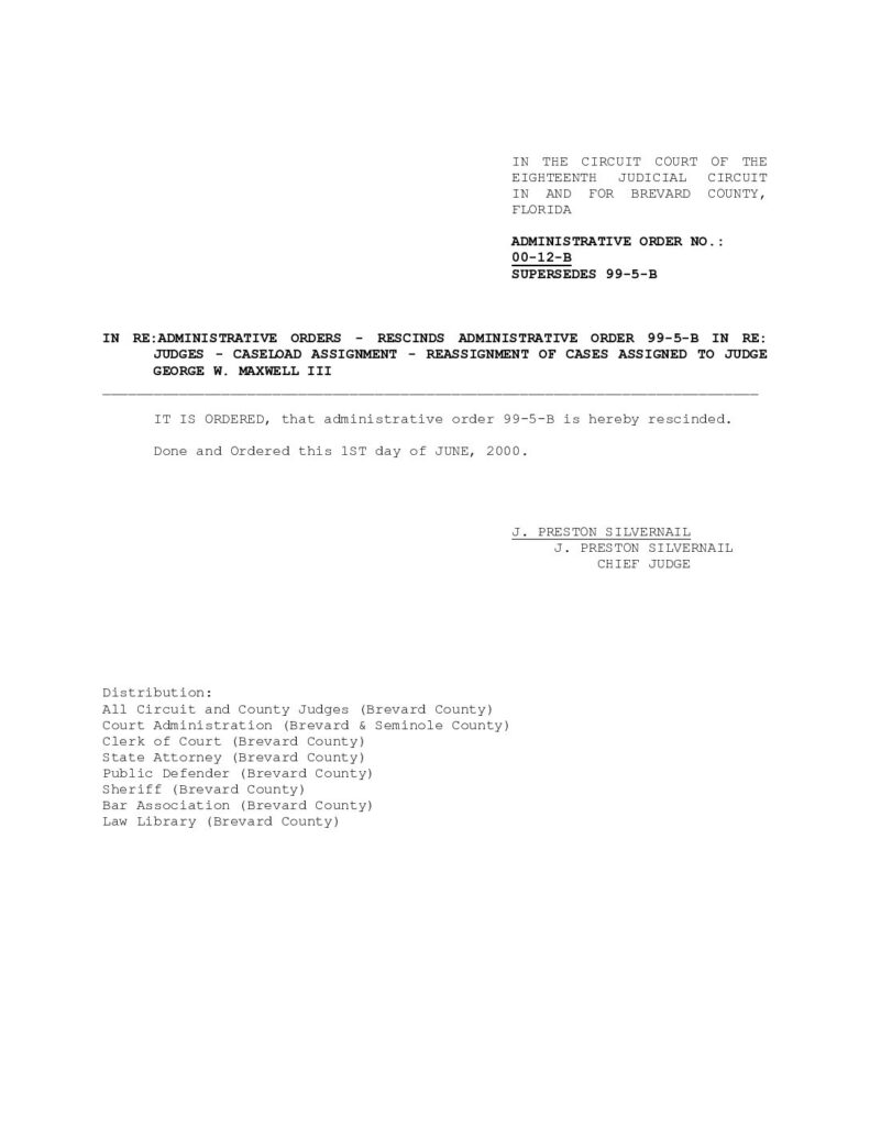 00-12-B, SUPERSEDES 99-5-B IN RE: ADMINISTRATIVE ORDERS – RESCINDS ADMINISTRATIVE ORDER 99-5-B IN RE: JUDGES – CASELOAD ASSIGNMENT – REASSIGNMENT OF CASES ASSIGNED TO JUDGE GEORGE W. MAXWELL III – ORDERED 6/01/2000 BY J. PRESTON SILVERNAIL