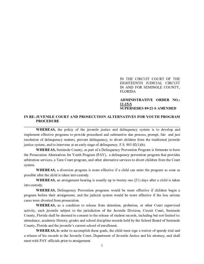 11-15-S, SUPERSEDES 09-21-S AMENDED IN RE: JUVENILE COURT AND PROSECUTION ALTERNATIVES FOR YOUTH PROGRAM PROCEDURE – ORDERED 4/19/2011 BY J. PRESTON SILVERNAIL
