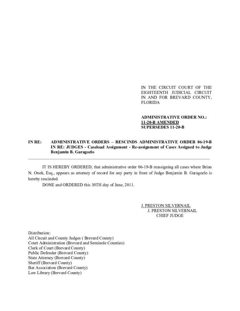 11-20-B AMENDED, SUPERSEDES 11-20-B IN RE: ADMINISTRATIVE ORDERS – RESCINDS ADMINISTRATIVE ORDER 06-19-B IN RE: JUDGES – CASELOAD ASSIGNMENT – CASELOAD RE-ASSIGNMENT OF CASES ASSIGNED TO JUDGE BENJAMIN B. GARAGOZLO – ORDERED 6/30/2011 BY J. PRESTON SILVERNAIL