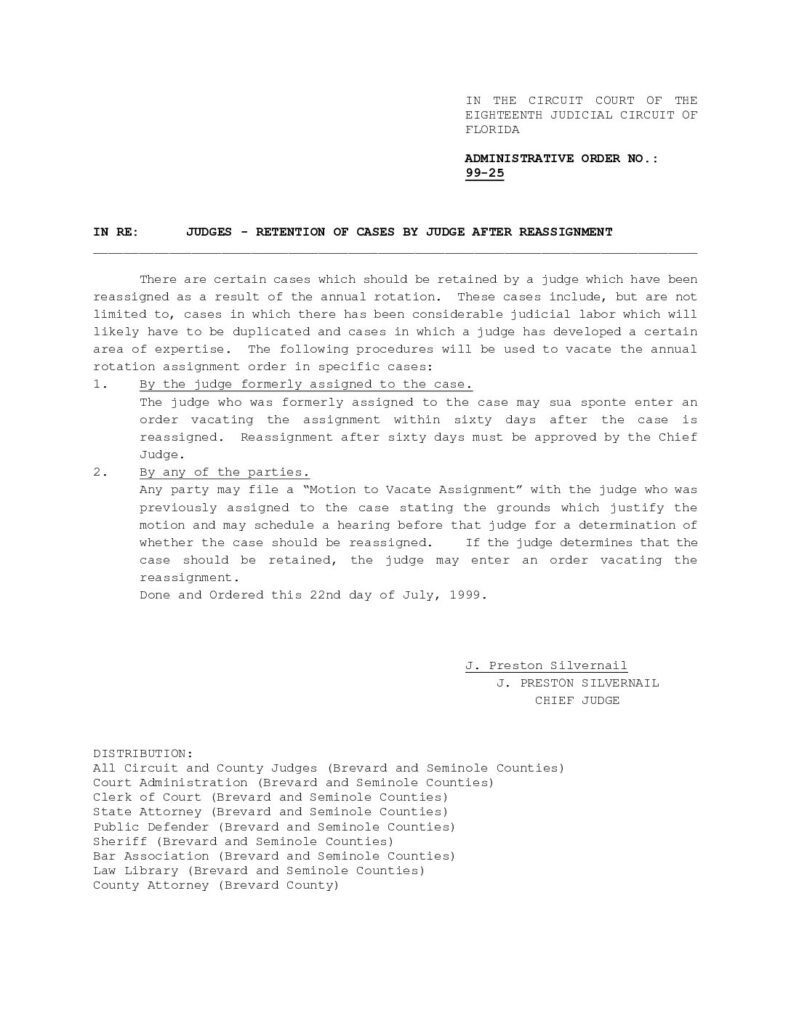 99-25 IN RE: JUDGES – RETENTION OF CASES BY JUDGE AFTER REASSIGNMENT – ORDERED 7/22/1999 BY J. PRESTON SILVERNAIL