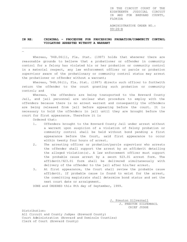 99-26-B IN RE: CRIMINAL – PROCEDURE FOR PROCESSING PROBATION/COMMUNITY CONTROL VIOLATORS ARRESTED WITHOUT A WARRANT – ORDERED 9/08/1999 BY J. PRESTON SILVERNAIL