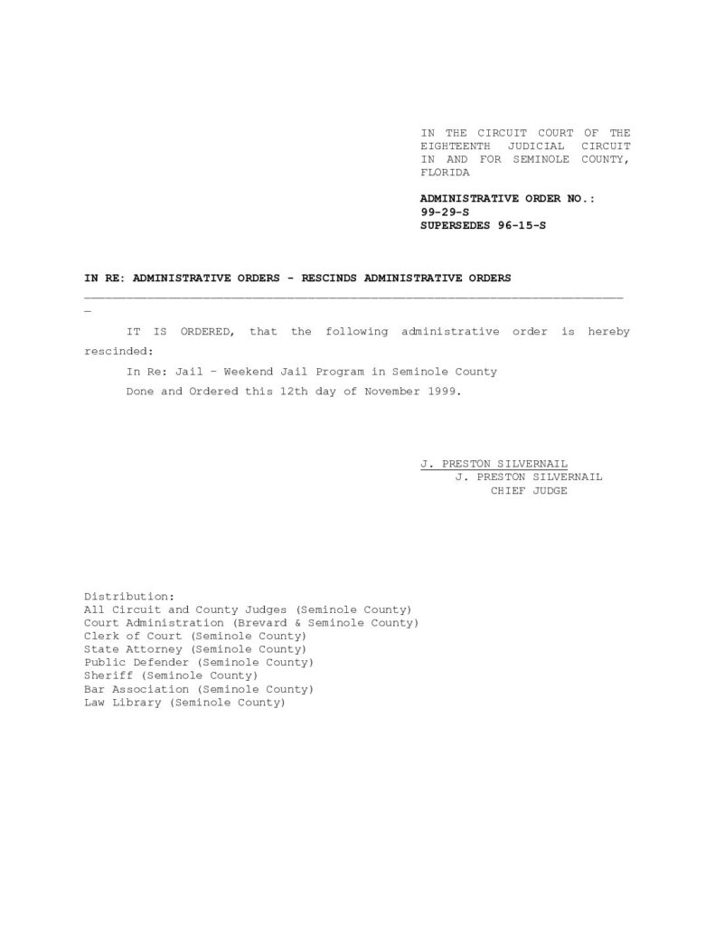99-29-S IN RE: RESCINDS ADMINISTRATIVE ORDERS: 96-15-S – ORDERED 11/12/1999 BY J. PRESTON SILVERNAIL