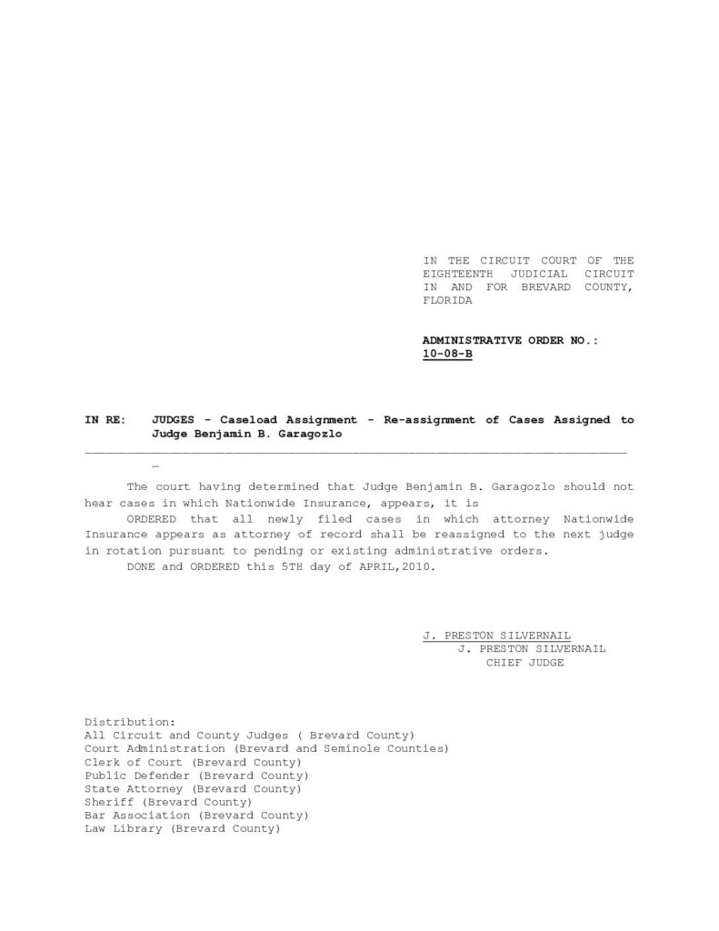 10-08-B IN RE: JUDGES – CASELOAD ASSIGNMENT, CASELOAD REASSIGNMENT OF CASES ASSIGNED TO JUDGE BENJAMIN B. GARAGOZLO – ORDERED 4/5/2010 BY J. PRESTON SILVERNAIL