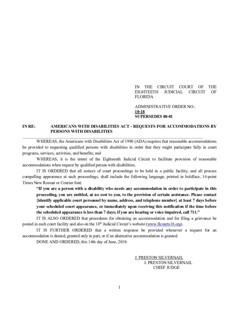 10-18, SUPERSEDES 08-01 IN RE: AMERICANS WITH DISABILITIES ACT – REQUESTS FOR ACCOMMODATIONS BY PERSONS WITH DISABILITIES – ORDERED 06/14/2010 BY J. PRESTON SILVERNAIL