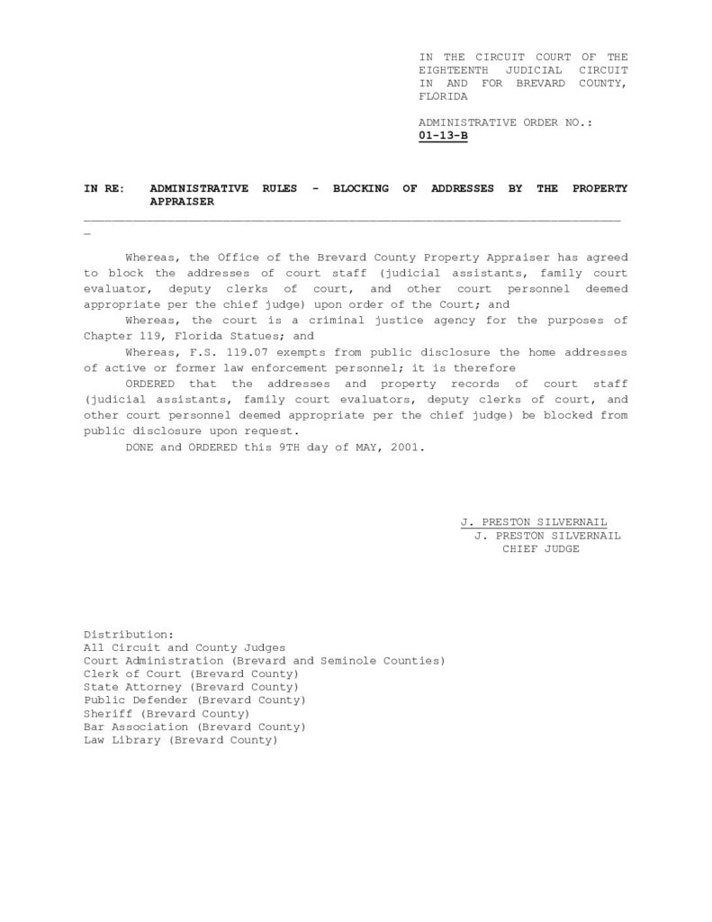 01-13-B IN RE: ADMINISTRATIVE RULES – BLOCKING OF ADDRESSES BY THE PROPERTY APPRAISER – ORDERED 5/9/2001 BY J. PRESTON SILVERNAIL
