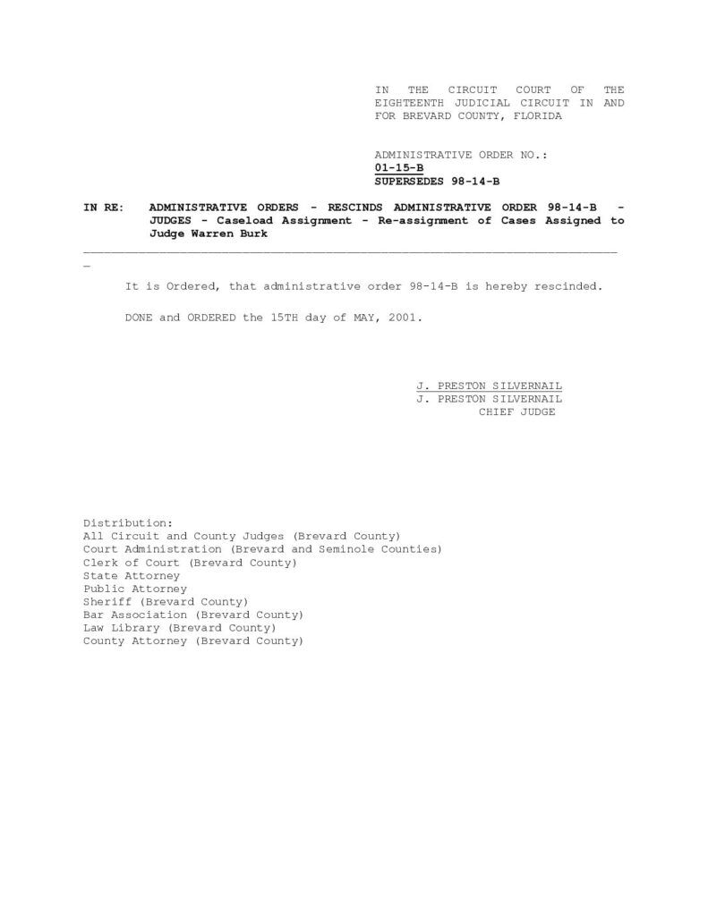 01-15-B, SUPERSEDES 98-14-B IN RE: ADMINISTRATIVE ORDERS – RESCINDS ADMINISTRATIVE ORDER 98-14-B REASSIGNMENT OF CASES ASSIGNED TO JUDGE WARREN BURK – ORDERED 5/15/2001 BY J. PRESTON SILVERNAIL