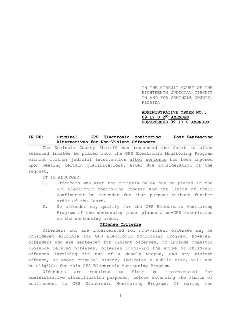 09-17-S 2ND AMENDED, SUPERSEDES 09-17-S AMENDED IN RE: CRIMINAL: GPS ELECTRONIC MONITORING, POST SENTENCING AND ALTERNATIVES FOR NON-VIOLENT OFFENDERS – ORDERED 10/08/2009 BY J. PRESTON SILVERNAIL