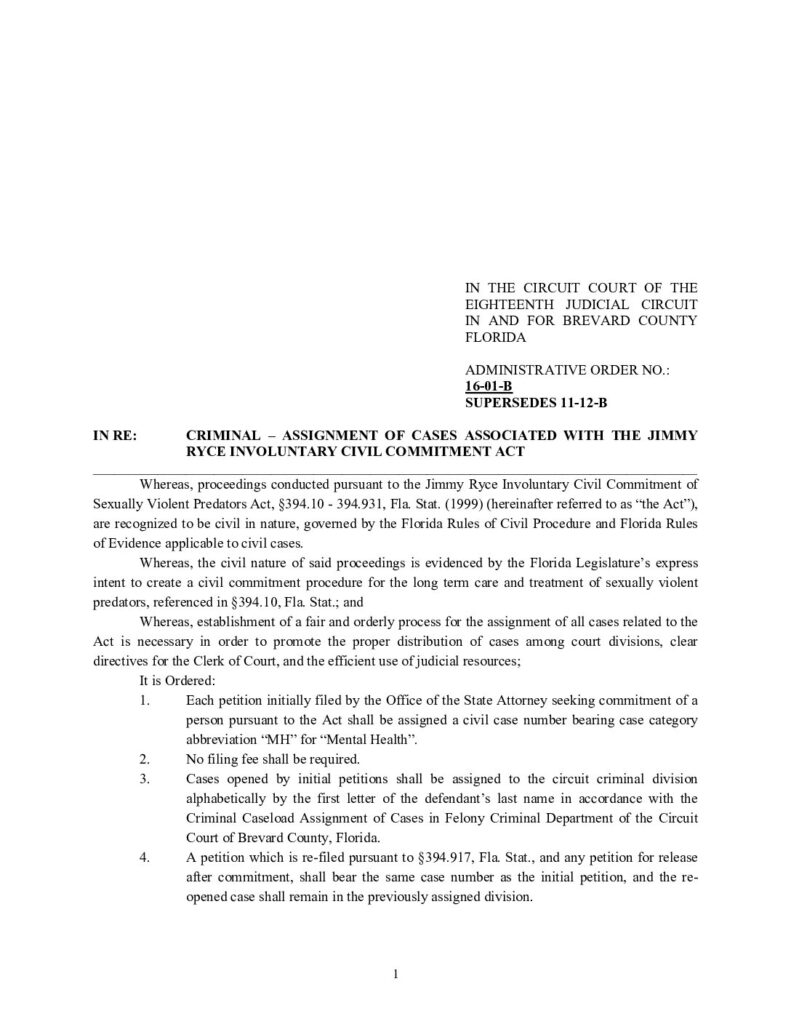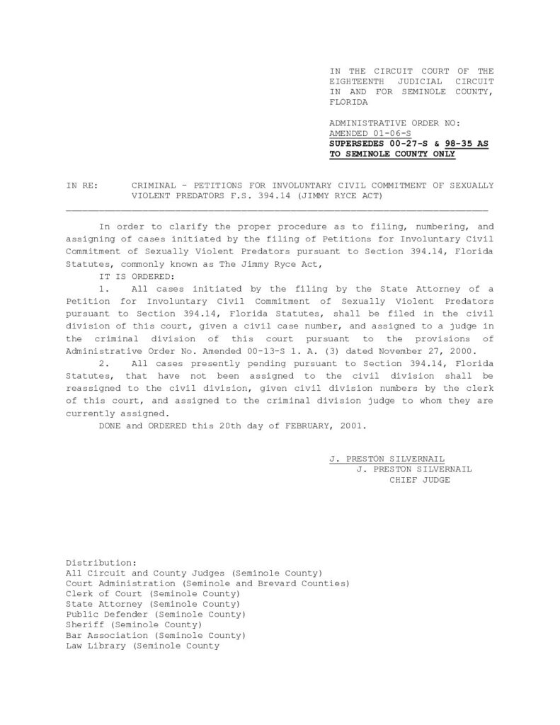 01-06-S AMENDED, SUPERSEDES 00-17-S AND 98-35 AS TO SEMINOLE COUNTY ONLY IN RE: CRIMINAL – PETITIONS FOR INVOLUNTARY CIVIL COMMITMENT OF SEXUALLY VIOLENT PREDATORS F.S. 394.14 (JIMMY RYCE ACT) – ORDERED 2/20/2001 BY J. PRESTON SILVERNAIL