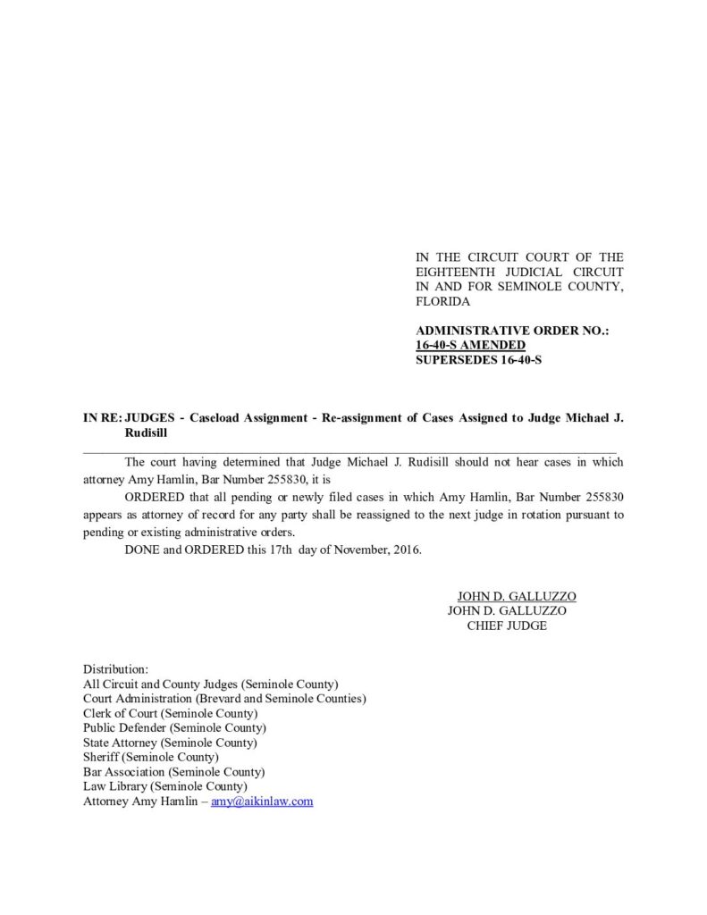 16-40-S AMENDED, SUPERSEDES 16-40-S IN RE: JUDGES – CASELOAD ASSIGNMENT, CASELOAD REASSIGNMENT ASSIGNED TO JUDGE MICHAEL J. RUDISILL – ORDERED 11/17/2016 BY JOHN D. GALLUZZO