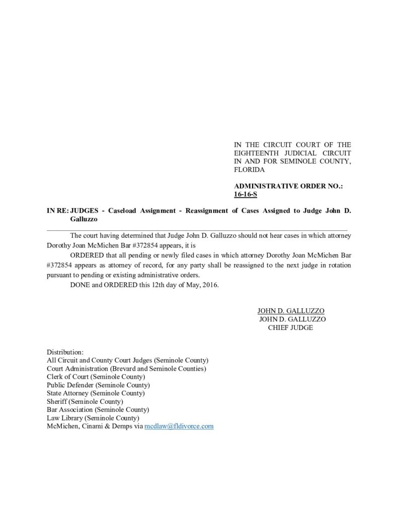 16-16-S IN RE: JUDGES – CASELOAD ASSIGNMENT, CASELOAD REASSIGNMENT OF CASES ASSIGNED TO JUDGE JOHN D. GALLUZZO – ORDERED 5/12/2016 BY JOHN D. GALLUZZO
